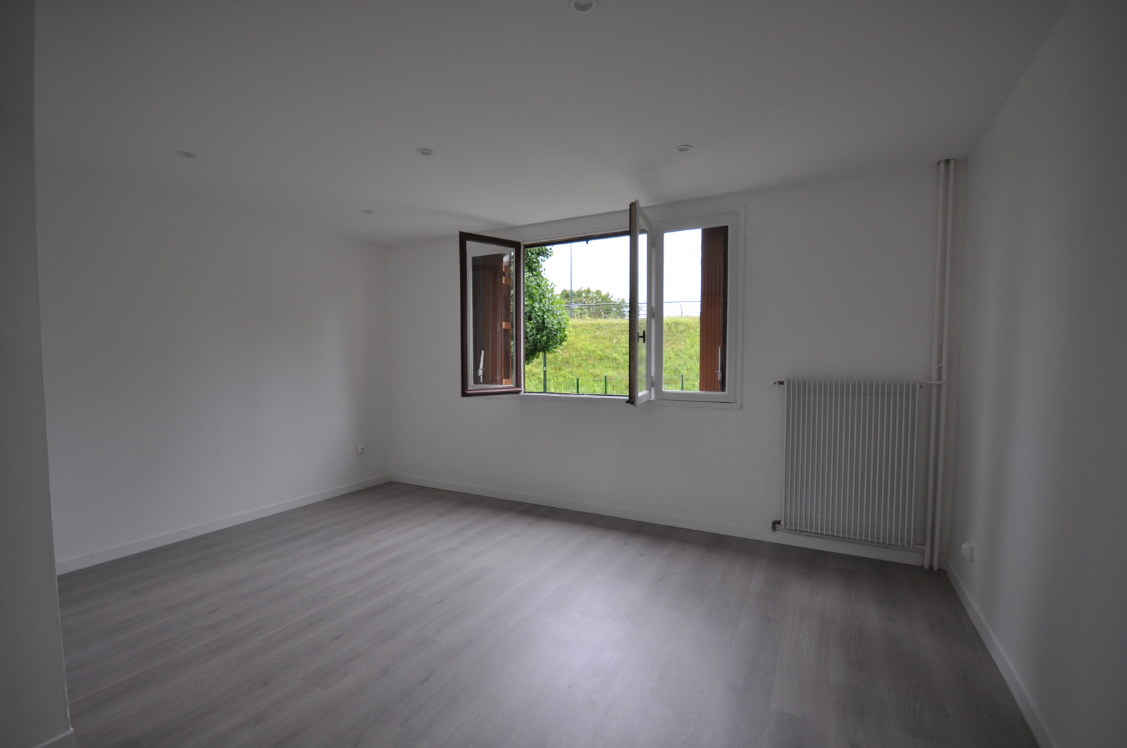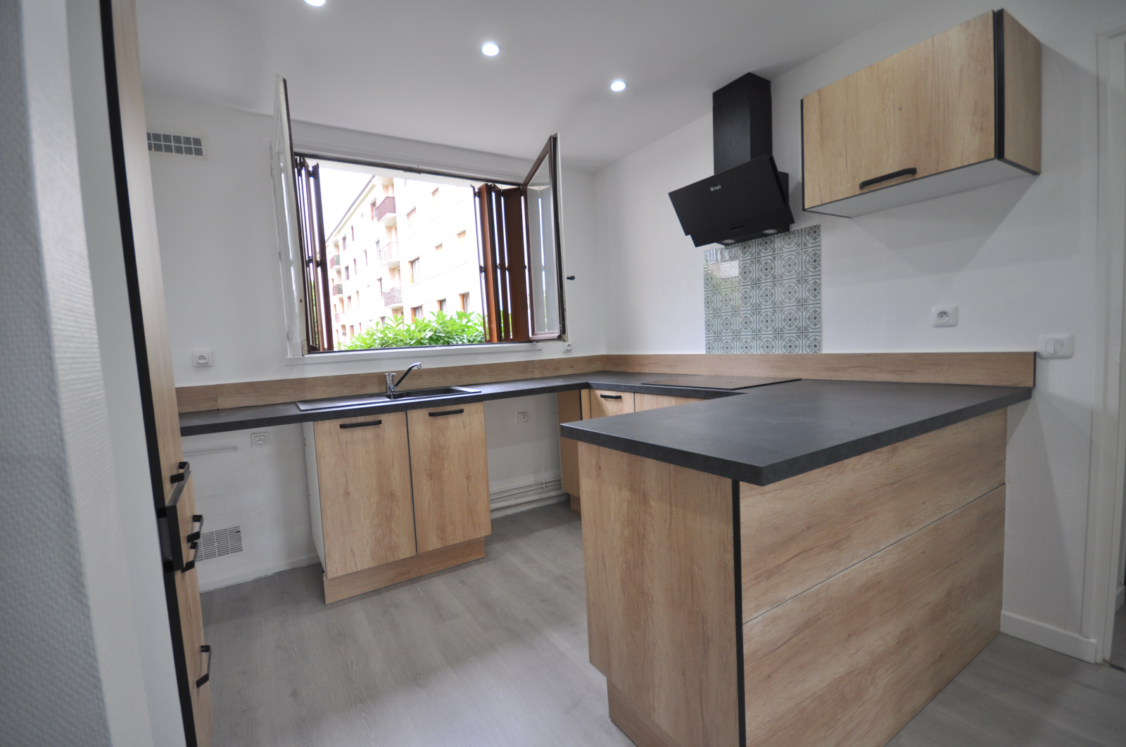 3 Pièces rez-de-chaussée surélevé - Séjour - Cuisine américaine aménagée et équipée de plaques et hotte - Dégagement avec placard - 2 chambres avec placard - Salle de douche - WC - Chauffage collectif compris dans les charges - 1 cave - 1 place de parking.