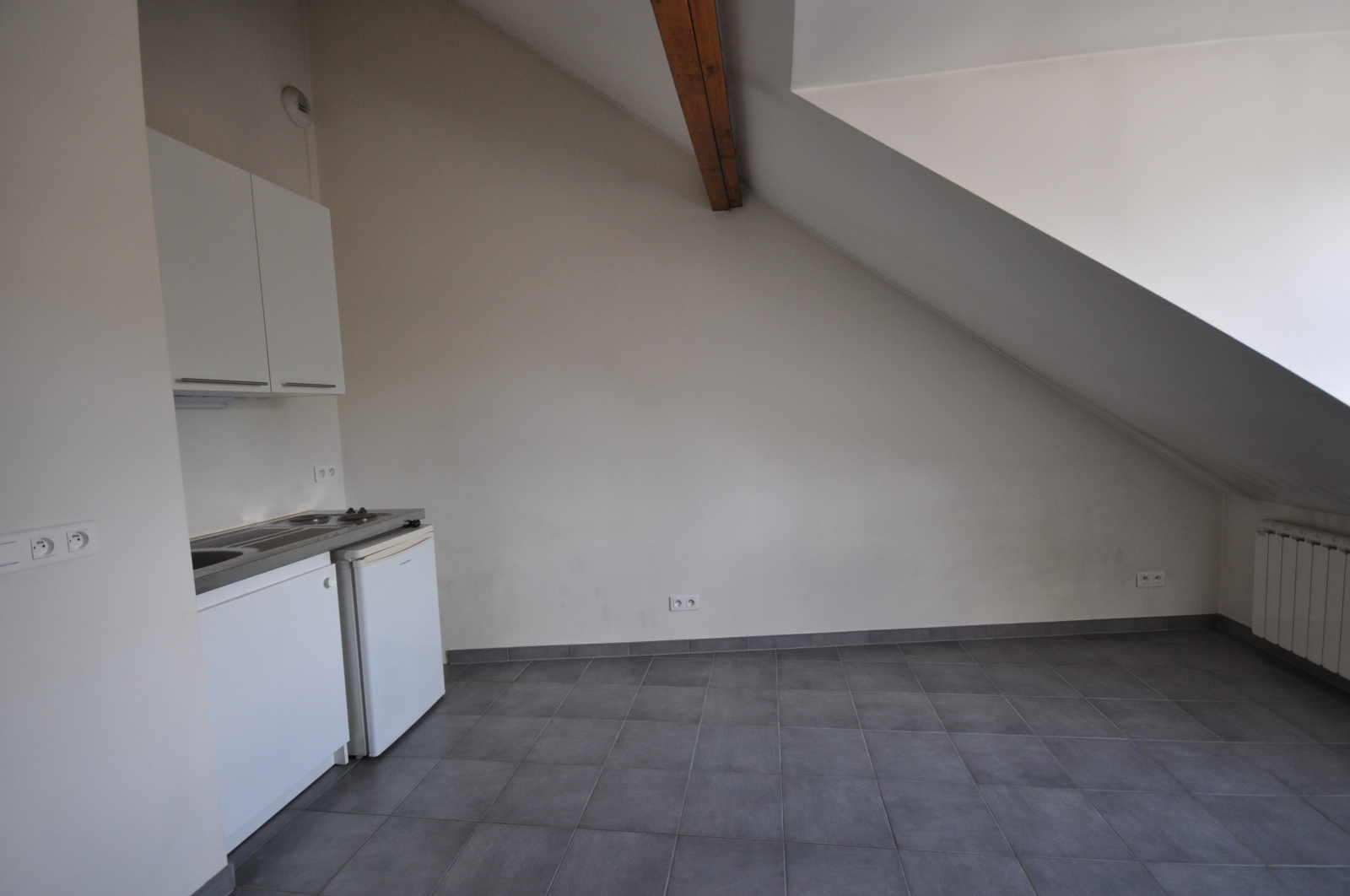 Studio mansardé au 2ème étage d'une petite résidence récente du centre-ville - Entrée avec placard - Pièce principale avec kitchenette (plaques et réfrigérateur) - Salle de douche avec WC - Chauffage électrique individuel - 1 place de parking en sous-sol. Libre 1er février 2026.